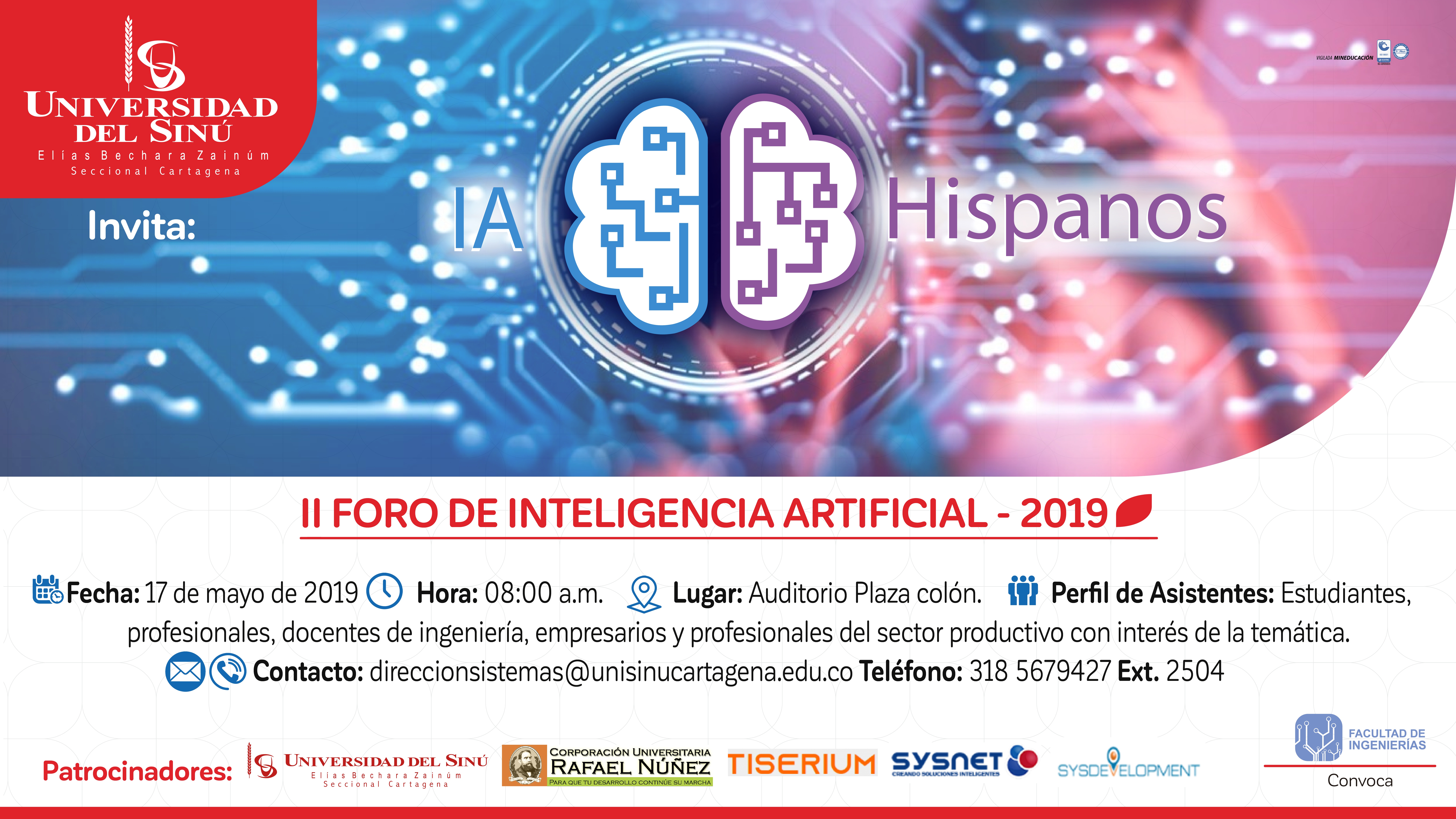 El II Foro de Inteligencia Artificial Hispanos 2019 es un evento organizado por la Escuela de Ingeniería de Sistemas de la Universidad del Sinú y un grupo de empresarios hispanos. IA Hispanos se constituye como un foro científico para